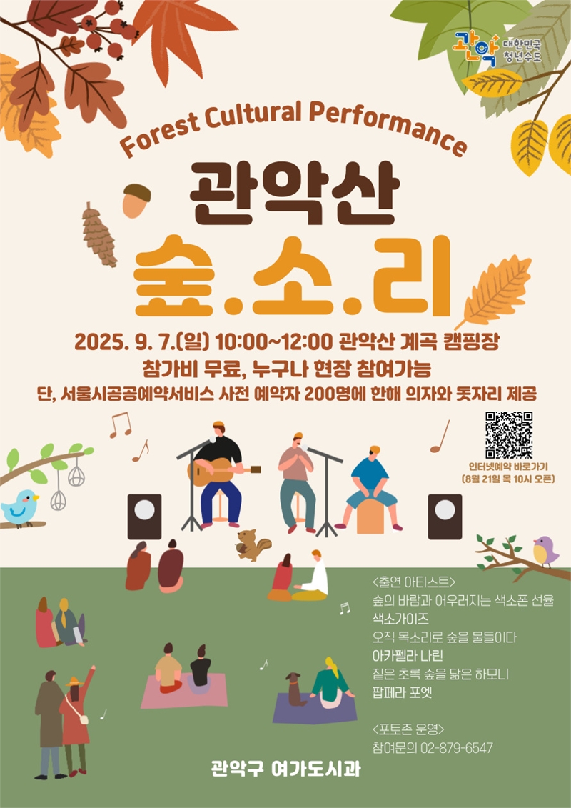 [프레스큐=김학주 기자] 관악구가 가을의 문턱에서 주민들에게 특별한 음악 선물을 준비했다.관악구는 오는 9월 7일 오전 10시부터 낮 12시까지 관악산 계곡 캠핑장에서 숲속 문화공연 ‘관악산 숲. 소. 리’를 연다. ‘숲(관악산)·소리(음악)·리(이야기)’라는 세 가지 요소를 담아낸 이번 행사는 자연과 예술이 어우러진