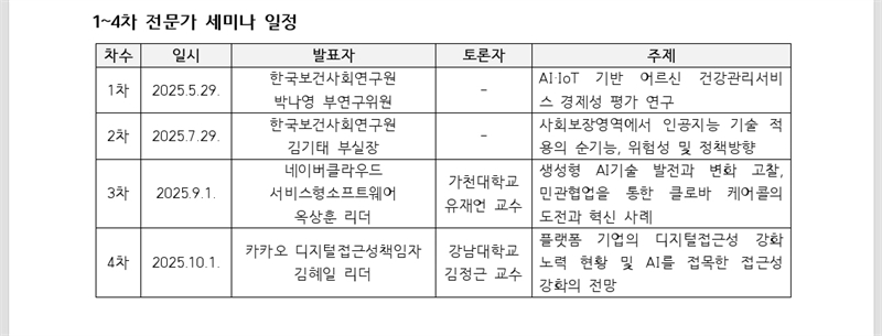 경기복지재단 'AI 기술 기반 노인돌봄사업 성과평가 연구' 전문가 세미나 일정표
