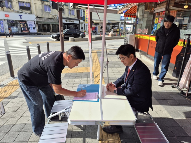 윤충식 경기도의원(右)이 10월 24일 포천시 신읍사거리에서 열린 ‘사법파괴·법원장악 반대 대국민 서명운동’ 현장에서 시민의 서명을 받고 있다.