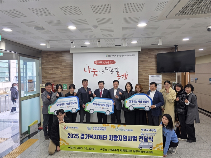 경기도의회 이병길 의원(左 다섯번째)이 남양주시 사회복지관 남부희망케어센터에서 열린 ‘2025년 경기도 사회복지시설 차량 지원 사업’ 전달식에 참석해 기념사진 촬영을 하고 있다.
