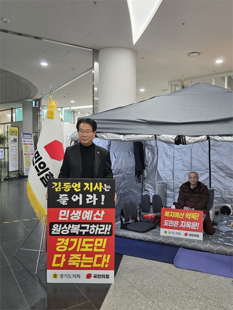 유영두 경기도의원이 경기도의회 단식농성장에서 민생예산 원상복구 시위를 하고 있다.(사진=프레스큐)