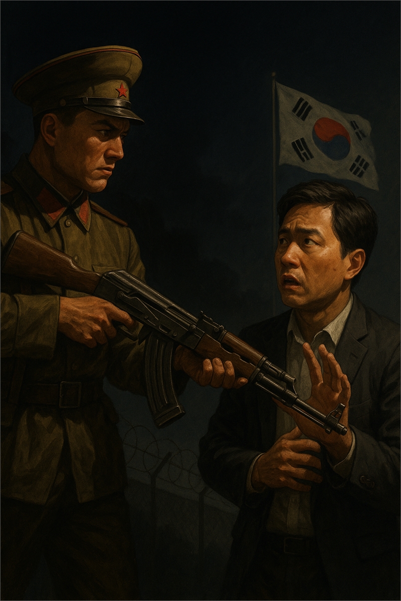 북한의 지속적인 군사적 위협 속에서 위험에 노출된 대한민국 국민의 현실을 상징적으로 표현한 장면.(사진=CHAT GPT)
