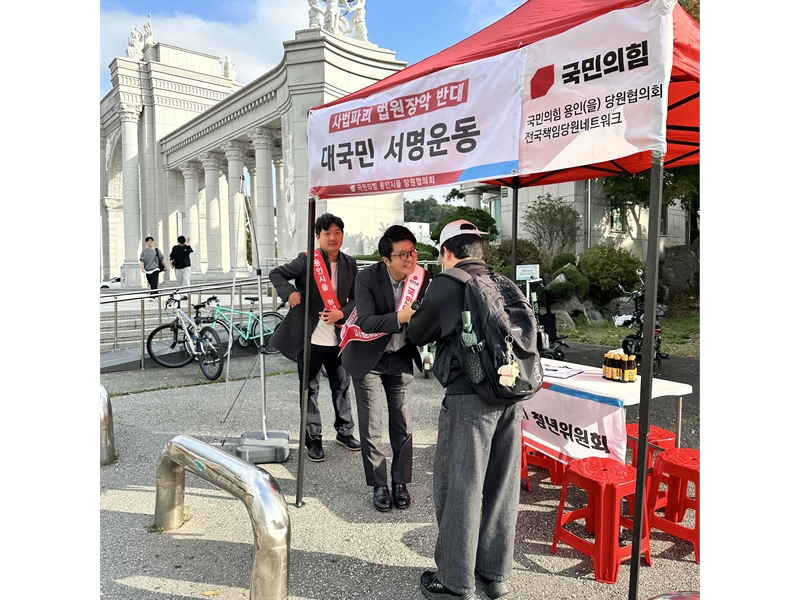[프레스큐=공경진 기자] 국민의힘 용인을 당원협의회 채진웅 위원장이, 지난 20일 수원 경희대학교 정문 앞에서 열린린 ‘사법파괴·법원장악 반대 대국민 서명운동’을 주도하며 “헌법 위에 군림하려는 세력의 독주를 국민의 힘으로 반드시 멈추겠다”고 밝혔다.이번 서명운동은 국민의힘 용인을 당원협의회와 청년위원회, 전국책임당원네트
