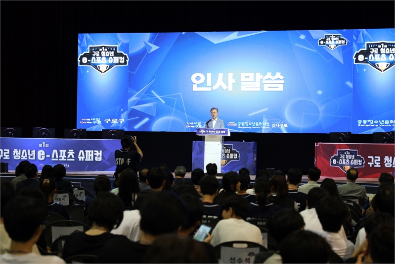 8월 23일 열린 ‘구로구 청소년 e스포츠 슈퍼컵’에서 장인홍 구로구청장이 인사말을 전하고 있다.