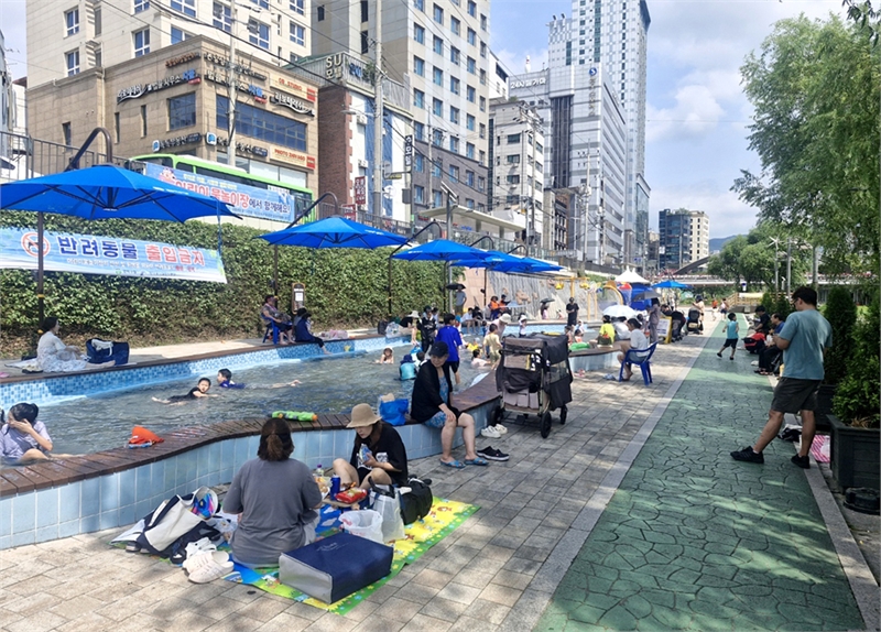 관악구 별빛내린천 물놀이장을 이용하고 있는 주민들