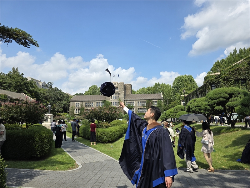 박상현 의원이 연세대학교 학위수여식에 참석하고, 석사모를 하늘에 던지고 있다.