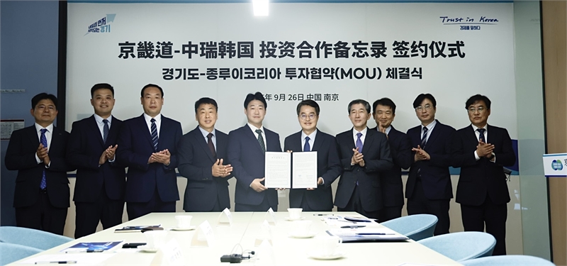 김동연 지사가 9월 26일 중국 장쑤성 난징에서 종루이코리아와 투자유치 협약을 체결하고 기념사진 촬영을 하고 있다.