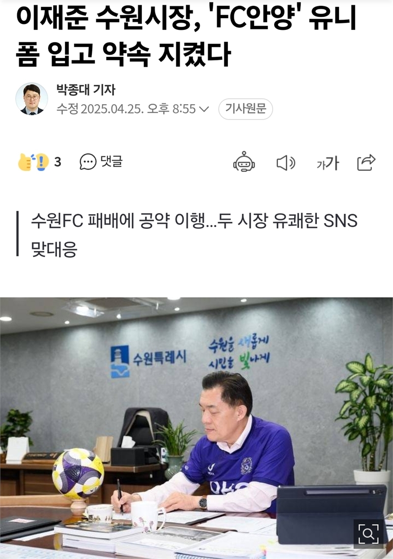 FC수원 구단주 이재준 수원특례시장이 FC안양 유니폼을 입고 시정업무를 보고 있다.(사진=뉴시스 기사 캡쳐)